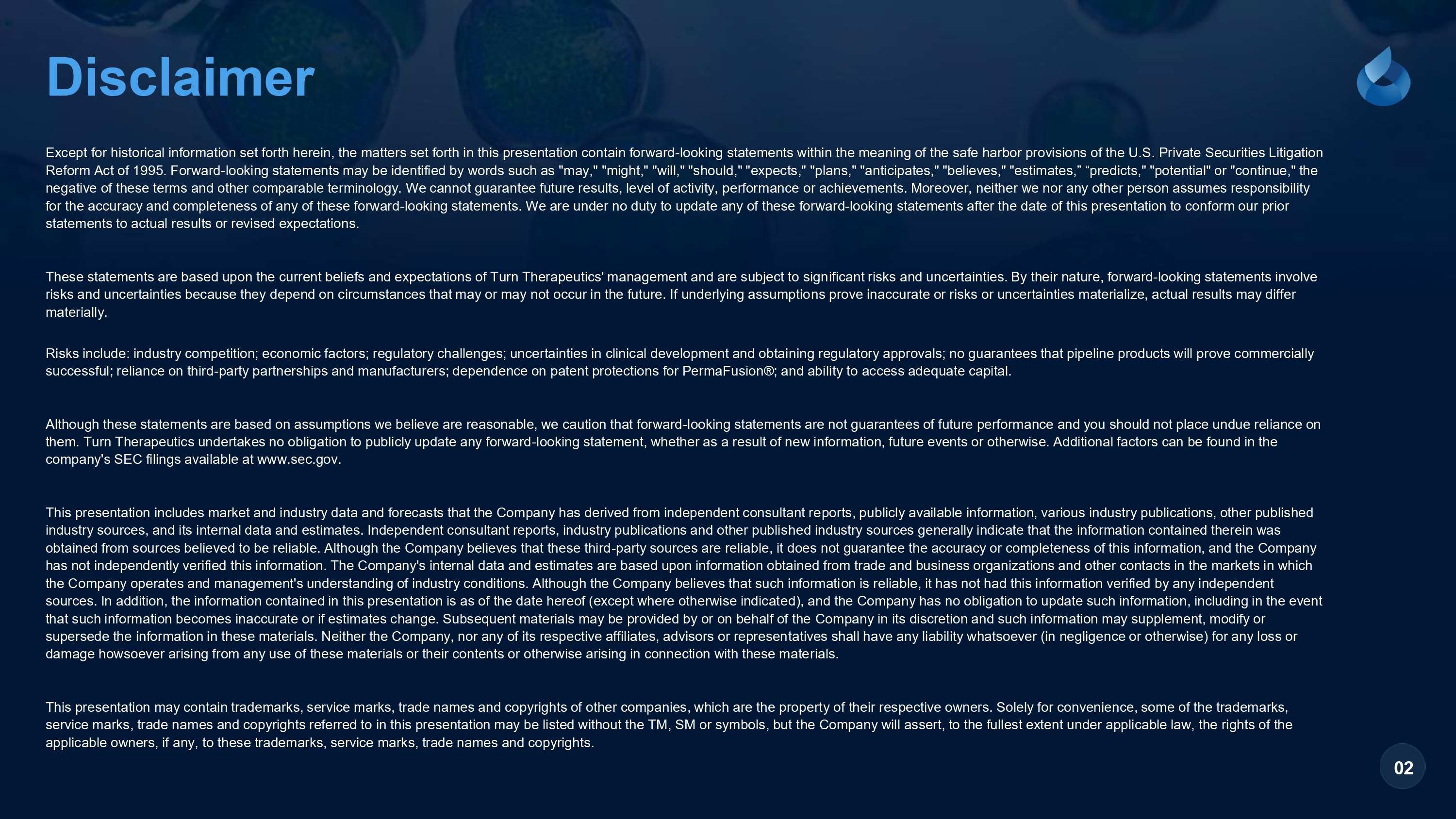 Disclaimer 02 Except for historical information set forth herein, the matters set forth in this presentation contain forward - looking statement s within the meaning of the safe harbor provisions of the U.S. Private Securities Litigation Reform Act of 1995. Forward - looking statements may be identified by words such as "may," "might," "will," "should," "expects," " plans," "anticipates," "believes," "estimates,” “predicts," "potential" or "continue," the negative of these terms and other comparable terminology. We cannot guarantee future results, level of activity, performance or achievements. Moreover, neither we nor any other person assumes responsibility for the accuracy and completeness of any of these forward - looking statements. We are under no duty to update any of these forwar d - looking statements after the date of this presentation to conform our prior statements to actual results or revised expectations. These statements are based upon the current beliefs and expectations of Turn Therapeutics' management and are subject to sign ifi cant risks and uncertainties. By their nature, forward - looking statements involve risks and uncertainties because they depend on circumstances that may or may not occur in the future. If underlying assumptio ns prove inaccurate or risks or uncertainties materialize, actual results may differ materially. Risks include: industry competition; economic factors; regulatory challenges; uncertainties in clinical development and obtai nin g regulatory approvals; no guarantees that pipeline products will prove commercially successful; reliance on third - party partnerships and manufacturers; dependence on patent protections for PermaFusion®; and abili ty to access adequate capital. Although these statements are based on assumptions we believe are reasonable, we caution that forward - looking statements are not guarantees of future performance and you should not place undue reliance on them. Turn Therapeutics undertakes no obligation to publicly update any forward - looking statement, whether as a result of new in formation, future events or otherwise. Additional factors can be found in the company's SEC filings available at www.sec.gov. This presentation includes market and industry data and forecasts that the Company has derived from independent consultant re por ts, publicly available information, various industry publications, other published industry sources, and its internal data and estimates. Independent consultant reports, industry publications and other publis hed industry sources generally indicate that the information contained therein was obtained from sources believed to be reliable. Although the Company believes that these third - party sources are reliable, it doe s not guarantee the accuracy or completeness of this information, and the Company has not independently verified this information. The Company's internal data and estimates are based upon information obtaine d f rom trade and business organizations and other contacts in the markets in which the Company operates and management's understanding of industry conditions. Although the Company believes that such informati on is reliable, it has not had this information verified by any independent sources. In addition, the information contained in this presentation is as of the date hereof (except where otherwise indicat ed) , and the Company has no obligation to update such information, including in the event that such information becomes inaccurate or if estimates change. Subsequent materials may be provided by or on behalf of the Com pany in its discretion and such information may supplement, modify or supersede the information in these materials. Neither the Company, nor any of its respective affiliates, advisors or represen tat ives shall have any liability whatsoever (in negligence or otherwise) for any loss or damage howsoever arising from any use of these materials or their contents or otherwise arising in connection with these mate ria ls. This presentation may contain trademarks, service marks, trade names and copyrights of other companies, which are the propert y o f their respective owners. Solely for convenience, some of the trademarks, service marks, trade names and copyrights referred to in this presentation may be listed without the TM, SM or symbols, but t he Company will assert, to the fullest extent under applicable law, the rights of the applicable owners, if any, to these trademarks, service marks, trade names and copyrights.