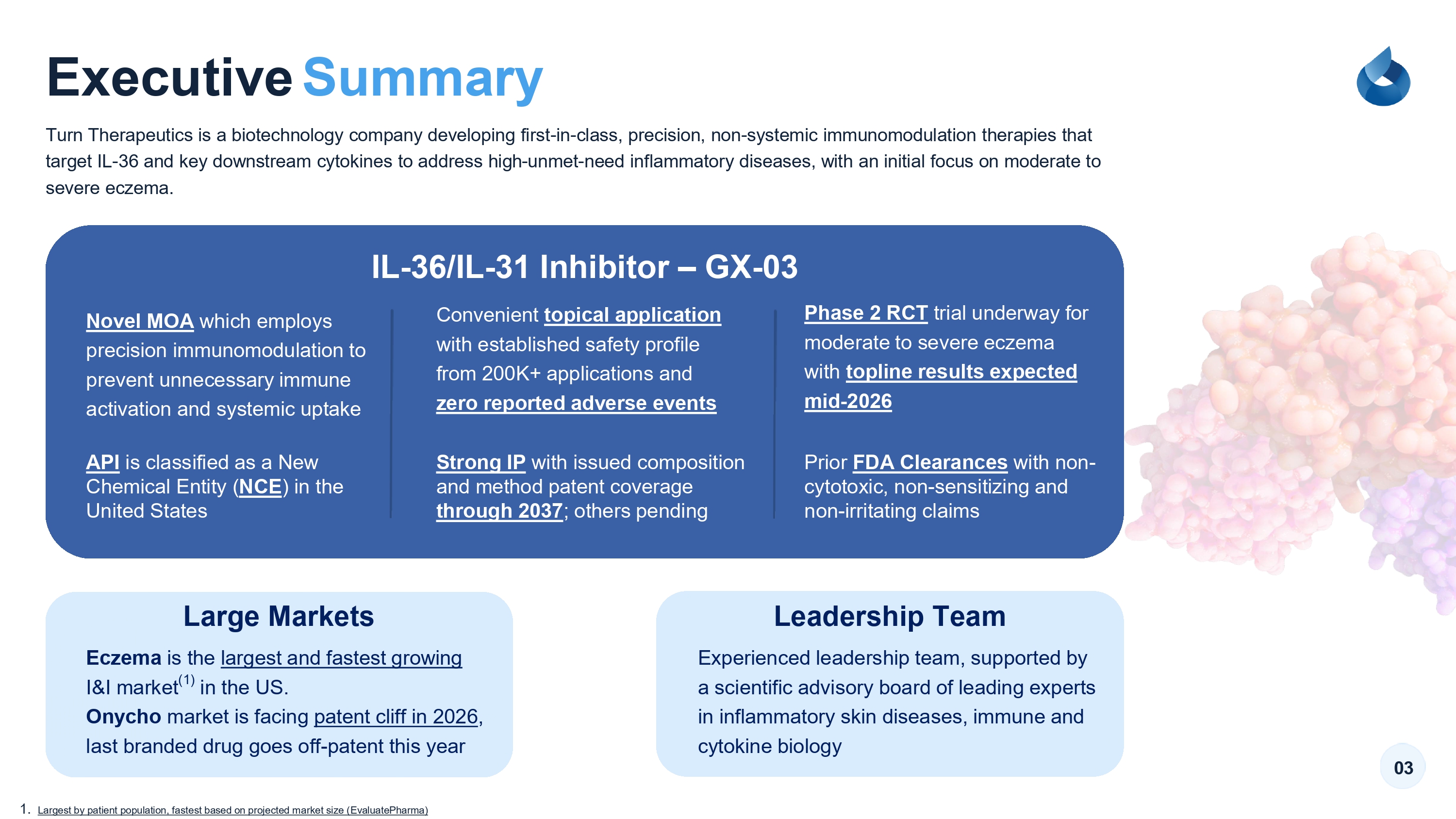 Executive Summary 03 Turn Therapeutics is a biotechnology company developing first - in - class, precision, non - systemic immunomodulation therapies that target IL - 36 and key downstream cytokines to address high - unmet - need inflammatory diseases, with an initial focus on moderate to severe eczema. API is classified as a New Chemical Entity ( NCE ) in the United States Convenient topical application with established safety profile from 200K+ applications and zero reported adverse events Strong IP with issued composition and method patent coverage through 2037 ; others pending Phase 2 RCT trial underway for moderate to severe eczema with topline results expected mid - 2026 Large Markets Leadership Team Eczema is the largest and fastest growing I&I market (1) in the US. Onycho market is facing patent cliff in 2026 , last branded drug goes off - patent this year 1. Largest by patient population, fastest based on projected market size ( EvaluatePharma) Experienced leadership team, supported by a scientific advisory board of leading experts in inflammatory skin diseases, immune and cytokine biology IL - 36/IL - 31 Inhibitor – GX - 03 Novel MOA which employs precision immunomodulation to prevent unnecessary immune activation and systemic uptake Prior FDA Clearances with non - cytotoxic, non - sensitizing and non - irritating claims