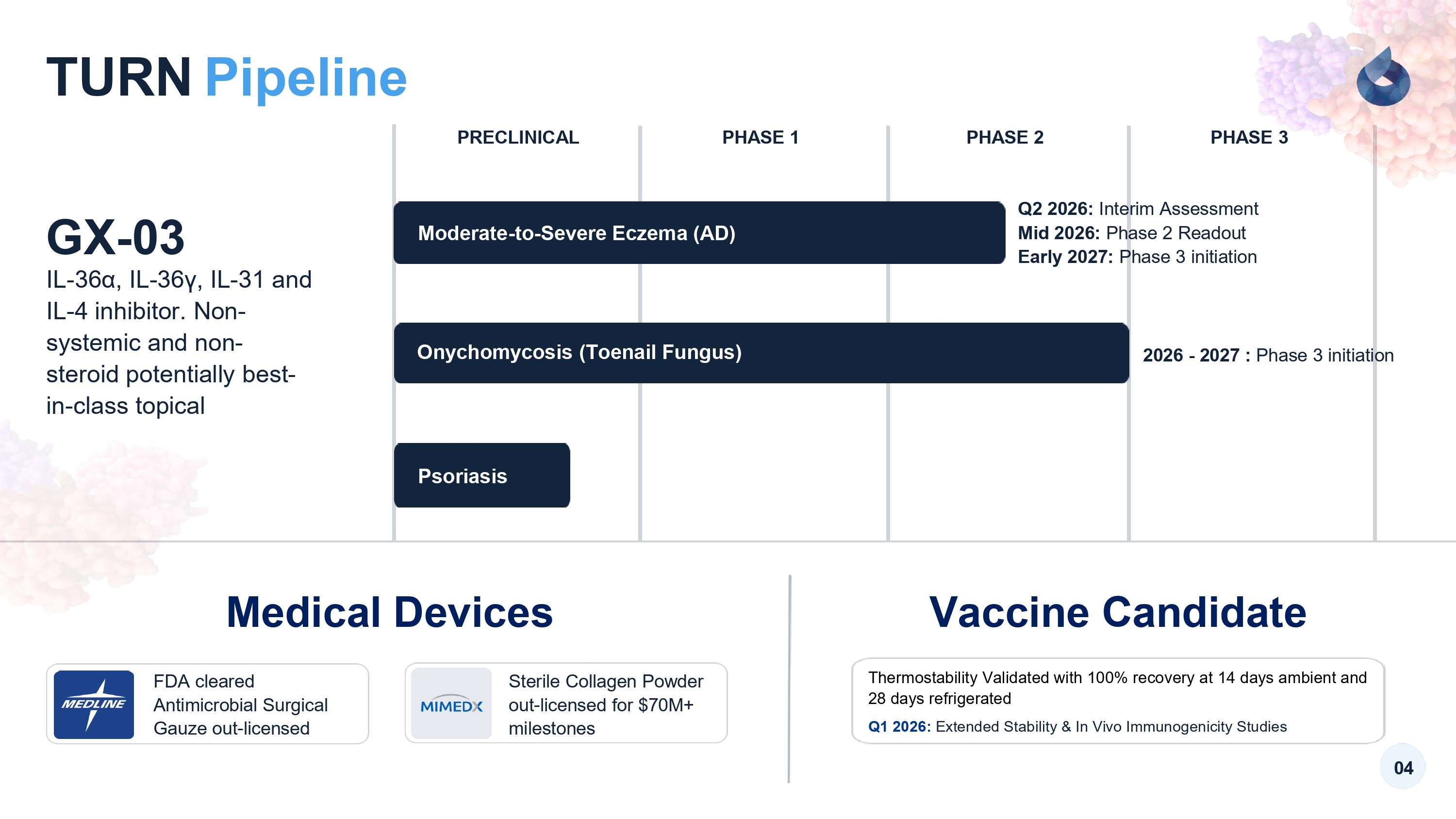 TURN Pipeline 04 GX - 03 PRECLINICAL Moderate - to - Severe Eczema (AD) Onychomycosis (Toenail Fungus) Psoriasis 2026 - 2027 : Phase 3 initiation PHASE 1 PHASE 2 PHASE 3 MedicalDevices IL - 36α, IL - 36γ, IL - 31 and IL - 4 inhibitor. Non - systemic and non - steroid potentially best - in - class topical FDA cleared Antimicrobial Surgical Gauze out - licensed Sterile Collagen Powder out - licensed for $70M+ milestones Q2 2026: Interim Assessment Mid 2026: Phase 2 Readout Early 2027: Phase 3 initiation Vaccine Candidate Thermostability Validated with 100% recovery at 14 days ambient and 28 days refrigerated Q1 2026: Extended Stability & In Vivo Immunogenicity Studies