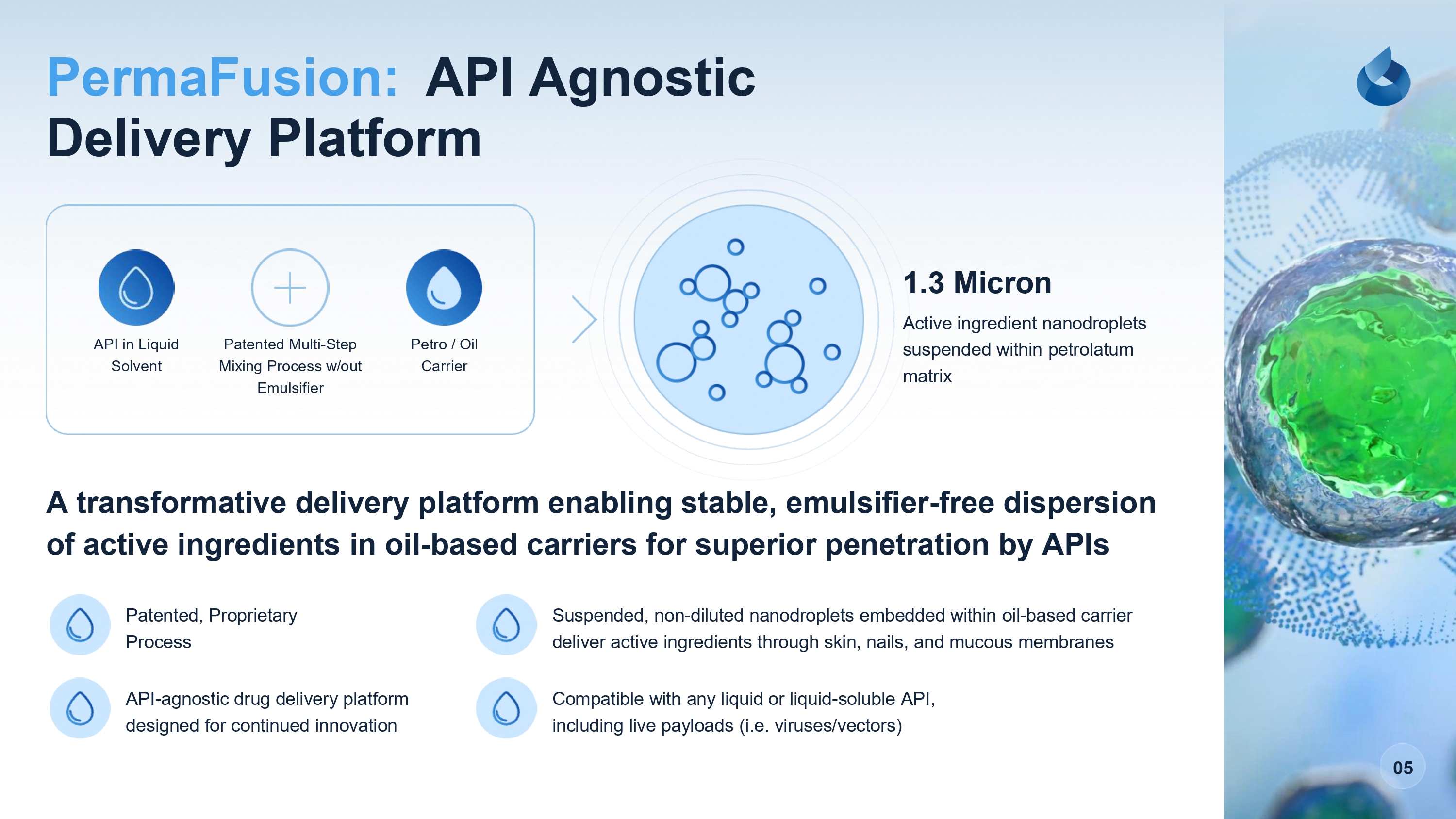 API Agnostic Delivery Platform PermaFusion: A transformative delivery platform enabling stable, emulsifier - free dispersion of active ingredients in oil - based carriers for superior penetration by APIs Patented, Proprietary Process API - agnostic drug delivery platform designed for continued innovation Suspended, non - diluted nanodroplets embedded within oil - based carrier deliver active ingredients through skin, nails, and mucous membranes Compatible with any liquid or liquid - soluble API, including live payloads (i.e. viruses/vectors) 05 1.3 Micron Active ingredient nanodroplets suspended within petrolatum matrix API in Liquid Solvent Patented Multi - Step Mixing Process w/out Emulsifier Petro / Oil Carrier