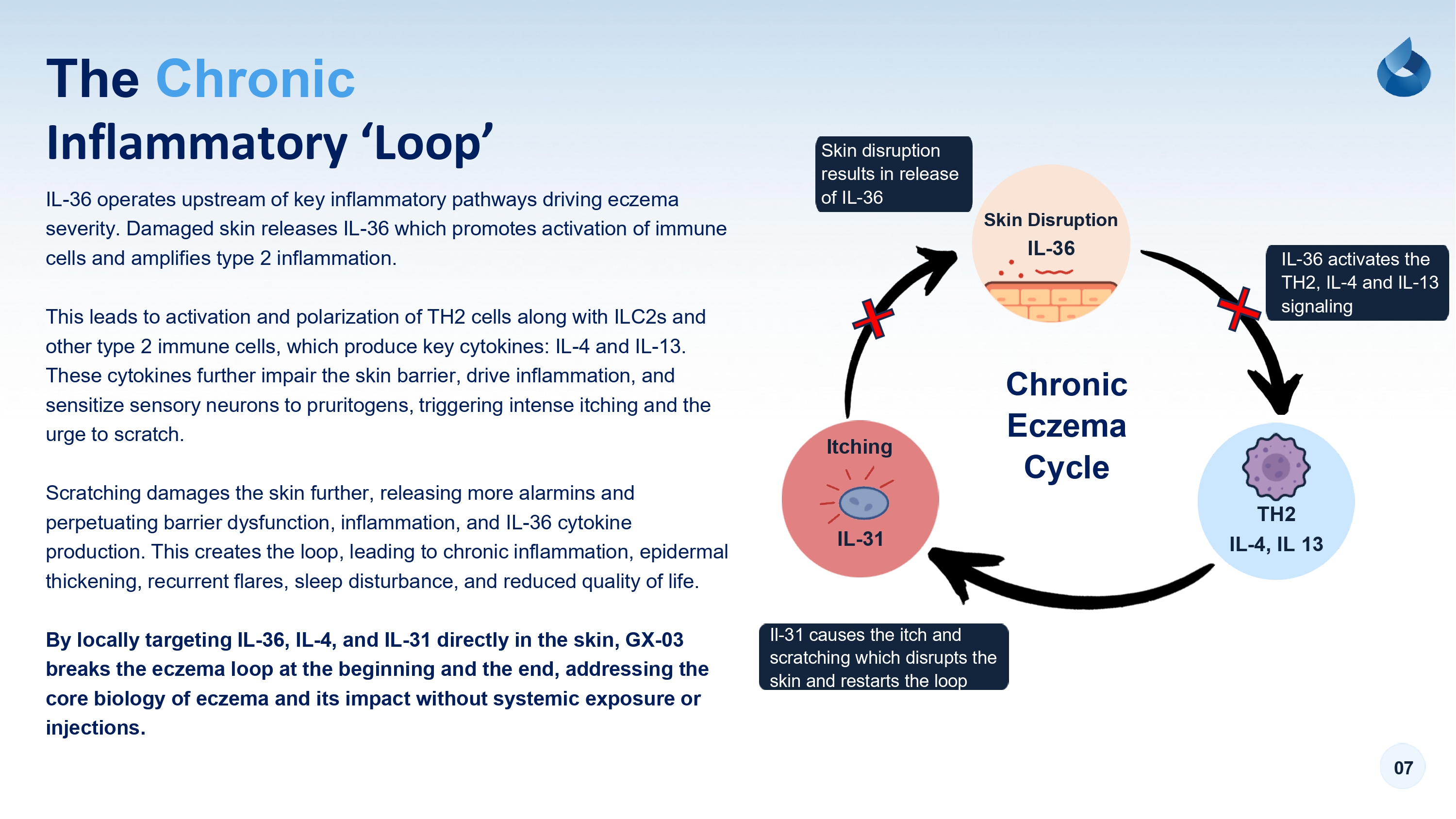 07 The Chronic Inflammatory ‘Loop’ IL - 36 operates upstream of key inflammatory pathways driving eczema severity. Damaged skin releases IL - 36 which promotes activation of immune cells and amplifies type 2 inflammation. This leads to activation and polarization of TH2 cells along with ILC2s and other type 2 immune cells, which produce key cytokines: IL - 4 and IL - 13. These cytokines further impair the skin barrier, drive inflammation, and sensitize sensory neurons to pruritogens, triggering intense itching and the urge to scratch. Scratching damages the skin further, releasing more alarmins and perpetuating barrier dysfunction, inflammation, and IL - 36 cytokine production. This creates the loop, leading to chronic inflammation, epidermal thickening, recurrent flares, sleep disturbance, and reduced quality of life. By locally targeting IL - 36, IL - 4, and IL - 31 directly in the skin, GX - 03 breaks the eczema loop at the beginning and the end, addressing the core biology of eczema and its impact without systemic exposure or injections. TH2 IL - 4, IL 13 IL - 31 Skin Disruption IL - 36 Chronic Eczema Cycle Itching Skin disruption results in release of IL - 36 IL - 36 activates the TH2, IL - 4 and IL - 13 signaling Il - 31 causes the itch and scratching which disrupts the skin and restarts the loop