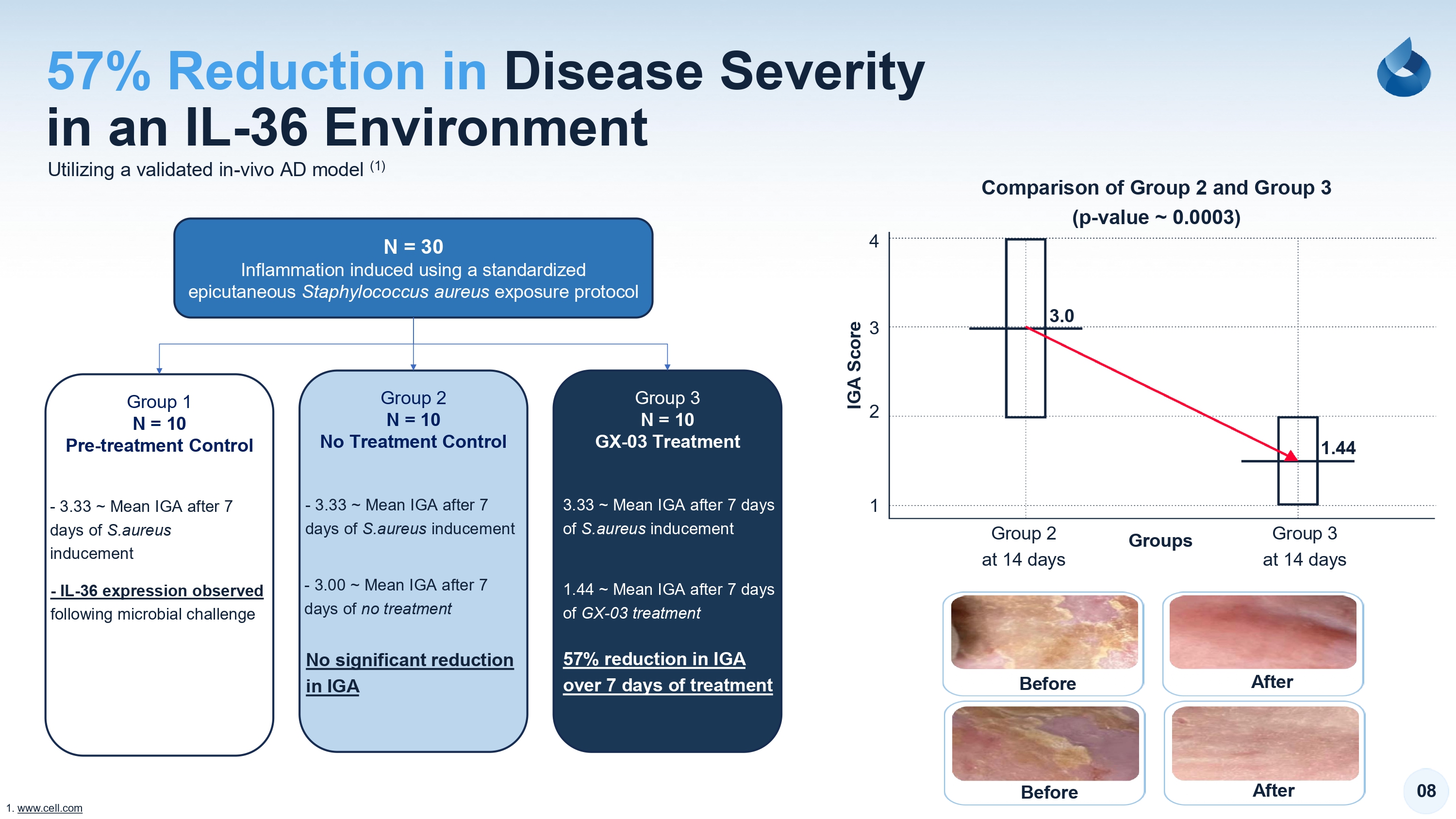 0 8 i n a n I L - 3 6 E n v i r o n m e n t 5 7 % R e d u c t i o n i n D i s e a s e S e v e r i t y Utilizing a validated in - vivo AD model (1) 1. www.cell.com N = 3 0 Inflammation induced using a standardized epicutaneous Staphylococcus aureus exposure protocol Group 1 N = 1 0 P r e - t r e a t m e n t C o n t r o l Group 2 N = 1 0 N o T r e a t m e n t C o n t r o l Group 3 N = 1 0 G X - 0 3 T r e a t m e n t - 3.33 ~ Mean IGA after 7 days of S.aureus inducement - 3.33 ~ Mean IGA after 7 days of S.aureus inducement 3.33 ~ Mean IGA after 7 days of S.aureus inducement - I L - 3 6 e x p r e s s i o n o b s e r v e d following microbial challenge - 3.00 ~ Mean IGA after 7 days of no treatment 1.44 ~ Mean IGA after 7 days of GX - 03 treatment 5 7 % r e d u c t i o n i n I G A o v e r 7 d a y s o f t r e a t m e n t 1 2 Group 2 at 14 days 3 . 0 1 . 4 4 Group 3 at 14 days G r o u p s 3 4 IGA Score C o m p a r i s o n o f G r o u p 2 a n d G r o u p 3 ( p - v a l u e ~ 0 . 0 0 0 3 ) B e f o r e A f t e r B e f o r e A f t e r N o s i g n i f i c a n t r e d u c t i o n i n I G A