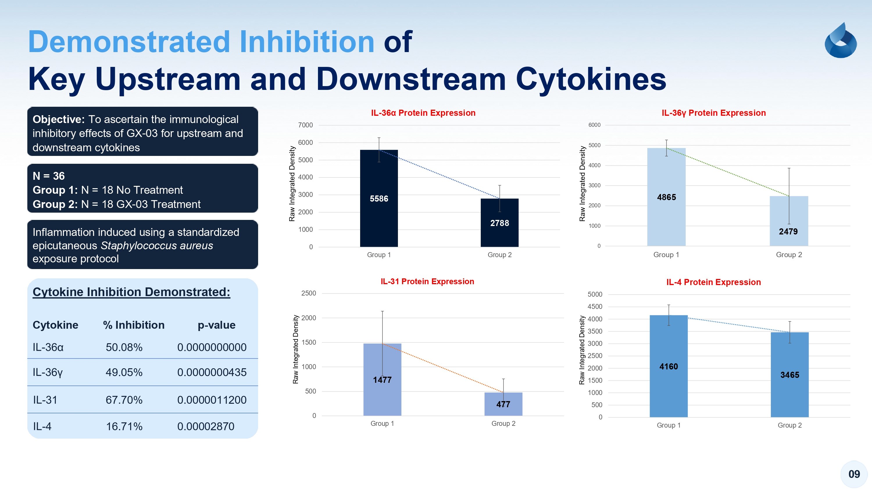 09 Key Upstream and Downstream Cytokines DemonstratedInhibition of Objective: T o a s c e r t a i n t h e i m m u n o l o g i c a l i n h i b i t o r y e f f e c t s o f G X - 0 3 f o r u p s t r e a m a n d d o w n s t r e a m c y t o k i n e s N = 36 Group 1: N = 1 8 N o T r e a t m e n t Group 2: N = 1 8 G X - 0 3 T r e a t m e n t 5 0 . 0 8 % 0 . 0 0 0 0 0 0 0 0 0 0 4 9 . 0 5 % 0 . 0 0 0 0 0 0 0 4 3 5 6 7 . 7 0 % 0 . 0 0 0 0 0 1 1 2 0 0 I n f l a m m a t i o n i n d u c e d u s i n g a s t a n d a r d i z e d e p i c u t a n e o u s Staphylococcus aureus e x p o s u r e p r o t o c o l Cytokine Inhibition Demonstrated: Cytokine % Inhibition p - value 1 6 . 7 1 % 0 . 0 0 0 0 2 8 7 0 5586 2788 0 1 0 0 0 2 0 0 0 3 0 0 0 4 0 0 0 5 0 0 0 6 0 0 0 7 0 0 0 G r o u p 1 G r o u p 2 Raw Integrated Density IL - 36α Protein Expression 4865 2479 0 1 0 0 0 2 0 0 0 3 0 0 0 4 0 0 0 5 0 0 0 6 0 0 0 G r o u p 1 G r o u p 2 Raw Integrated Density IL - 36γProtein Expression 1477 477 0 5 0 0 1 0 0 0 1 5 0 0 2 0 0 0 2 5 0 0 G r o u p 1 G r o u p 2 Raw Integrated Density IL - 31 Protein Expression 4160 3465 0 5 0 0 1 0 0 0 1 5 0 0 2 0 0 0 2 5 0 0 3 0 0 0 3 5 0 0 4 0 0 0 4 5 0 0 5 0 0 0 G r o u p 1 G r o u p 2 Raw Integrated Density IL - 4 Protein Expression