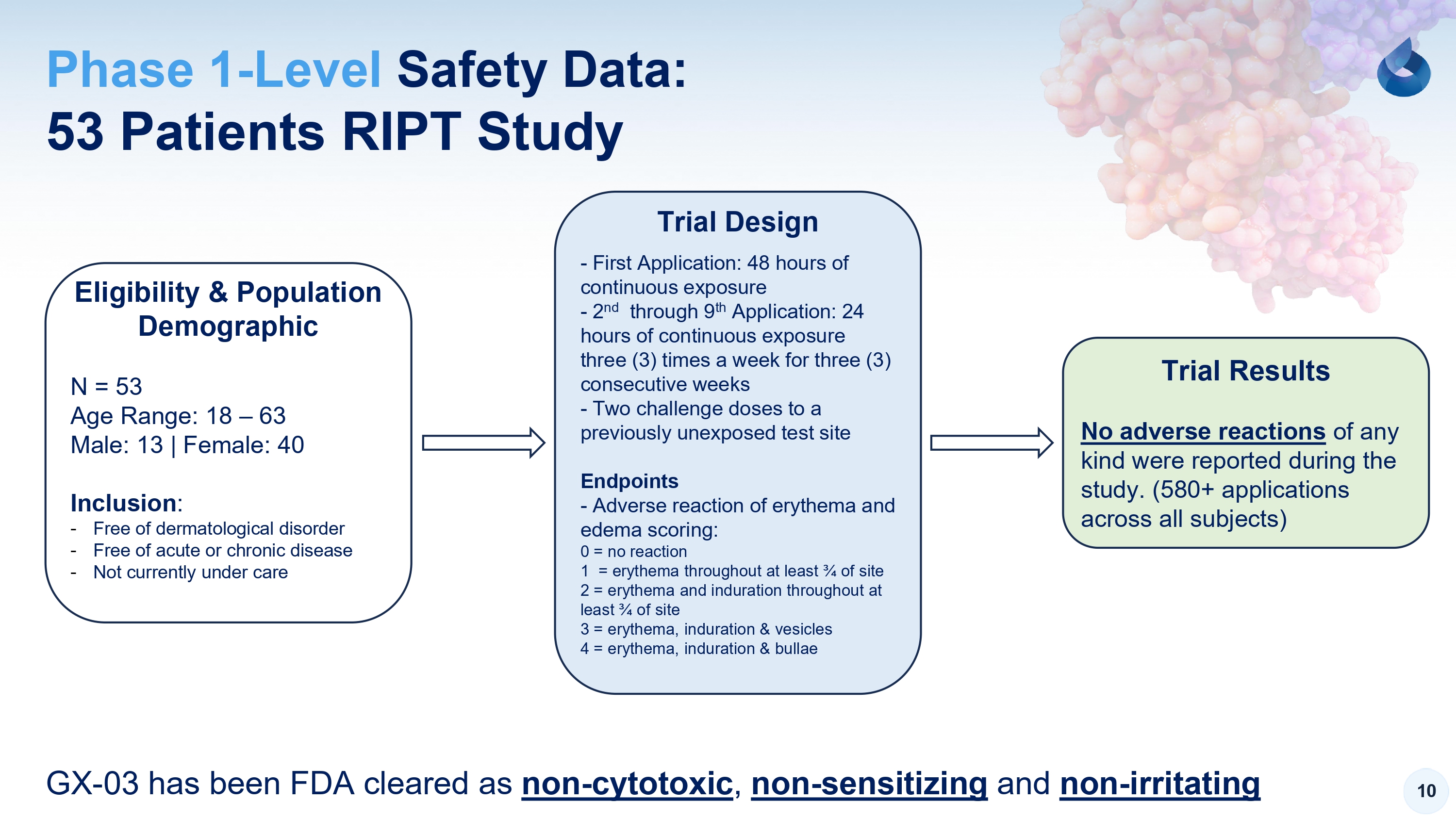 10 53 Patients RIPT Study Phase 1 - Level Safety Data: Eligibility & Population Demographic N = 53 Age Range: 18 – 63 Male: 13 | Female: 40 Inclusion : - Free of dermatological disorder - Free of acute or chronic disease - Not currently under care Trial Design - First Application: 48 hours of continuous exposure - 2 nd through 9 th Application: 24 hours of continuous exposure three (3) times a week for three (3) consecutive weeks - Two challenge doses to a previously unexposed test site Endpoints - Adverse reaction of erythema and edema scoring: 0 = no reaction 1 = erythema throughout at least ¾ of site 2 = erythema and induration throughout at least ¾ of site 3 = erythema, induration & vesicles 4 = erythema, induration & bullae Trial Results No adverse reactions of any kind were reported during the study. (580+ applications across all subjects) GX - 03 has been FDA cleared as non - cytotoxic , non - sensitizing and non - irritating