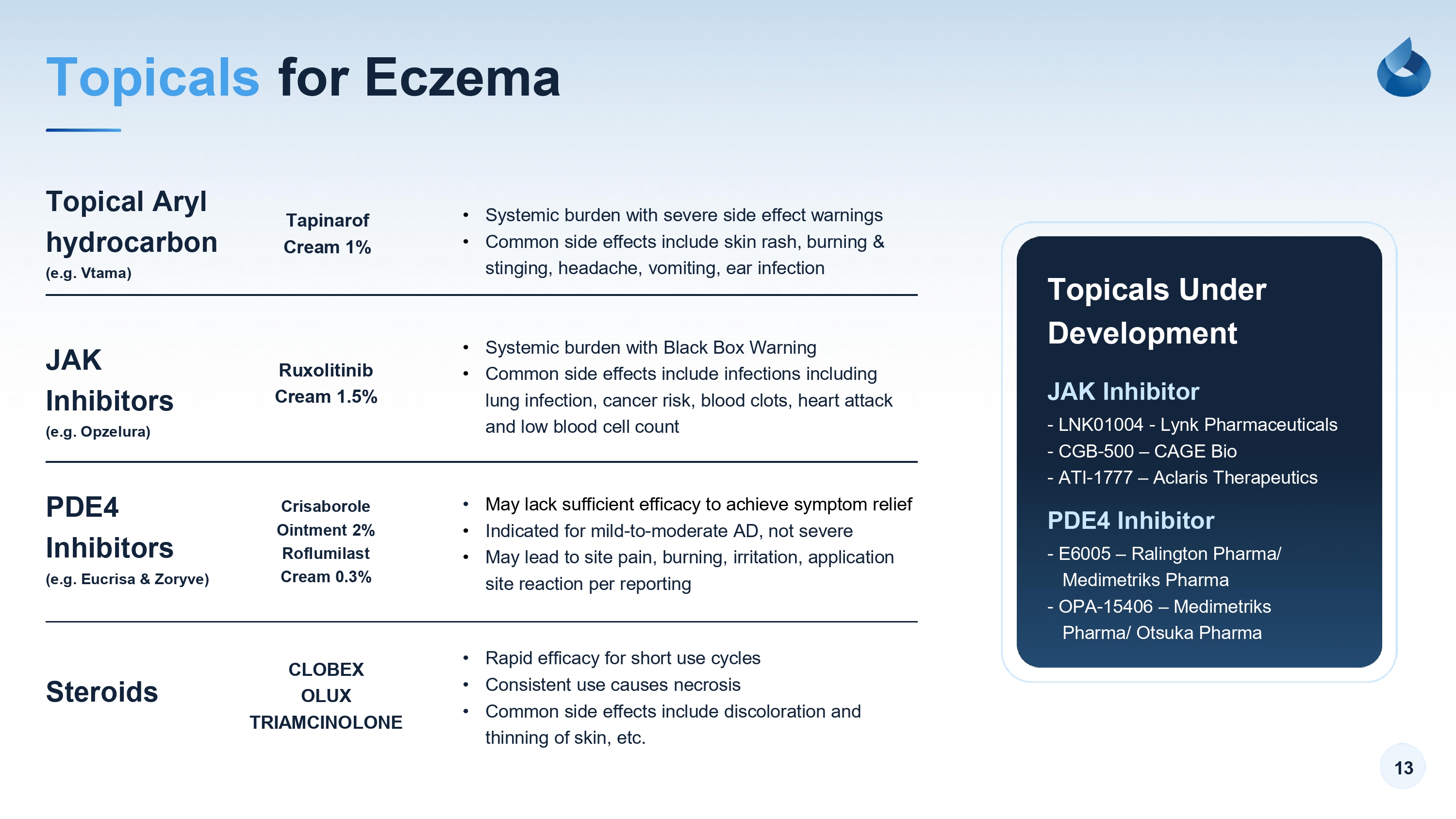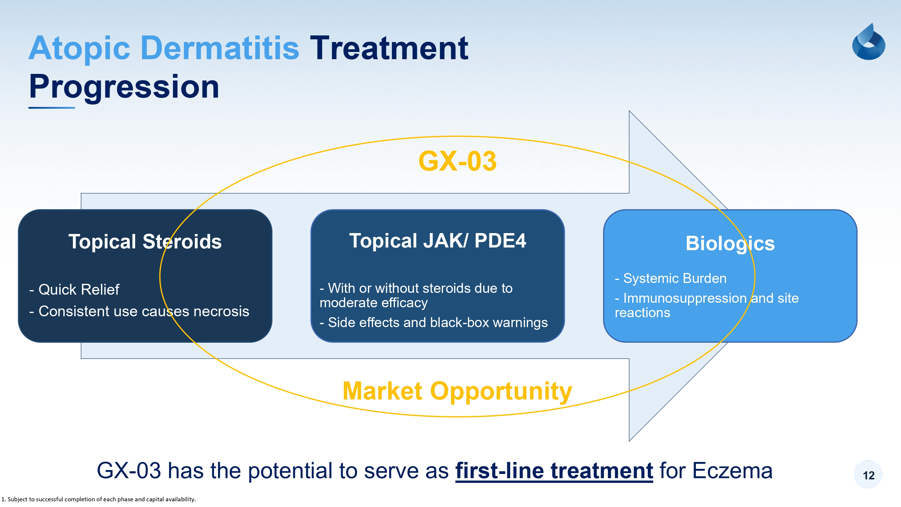 12 Progression Atopic Dermatitis Treatment GX - 03 has the potential to serve as first - line treatment for Eczema 1. Subject to successful completion of each phase and capital availability. Topical Steroids - Quick Relief - Consistent use causes necrosis Topical JAK/ PDE4 - With or without steroids due to moderate efficacy - Side effects and black - box warnings Biologics - Systemic Burden - Immunosuppression and site reactions GX - 03 Market Opportunity