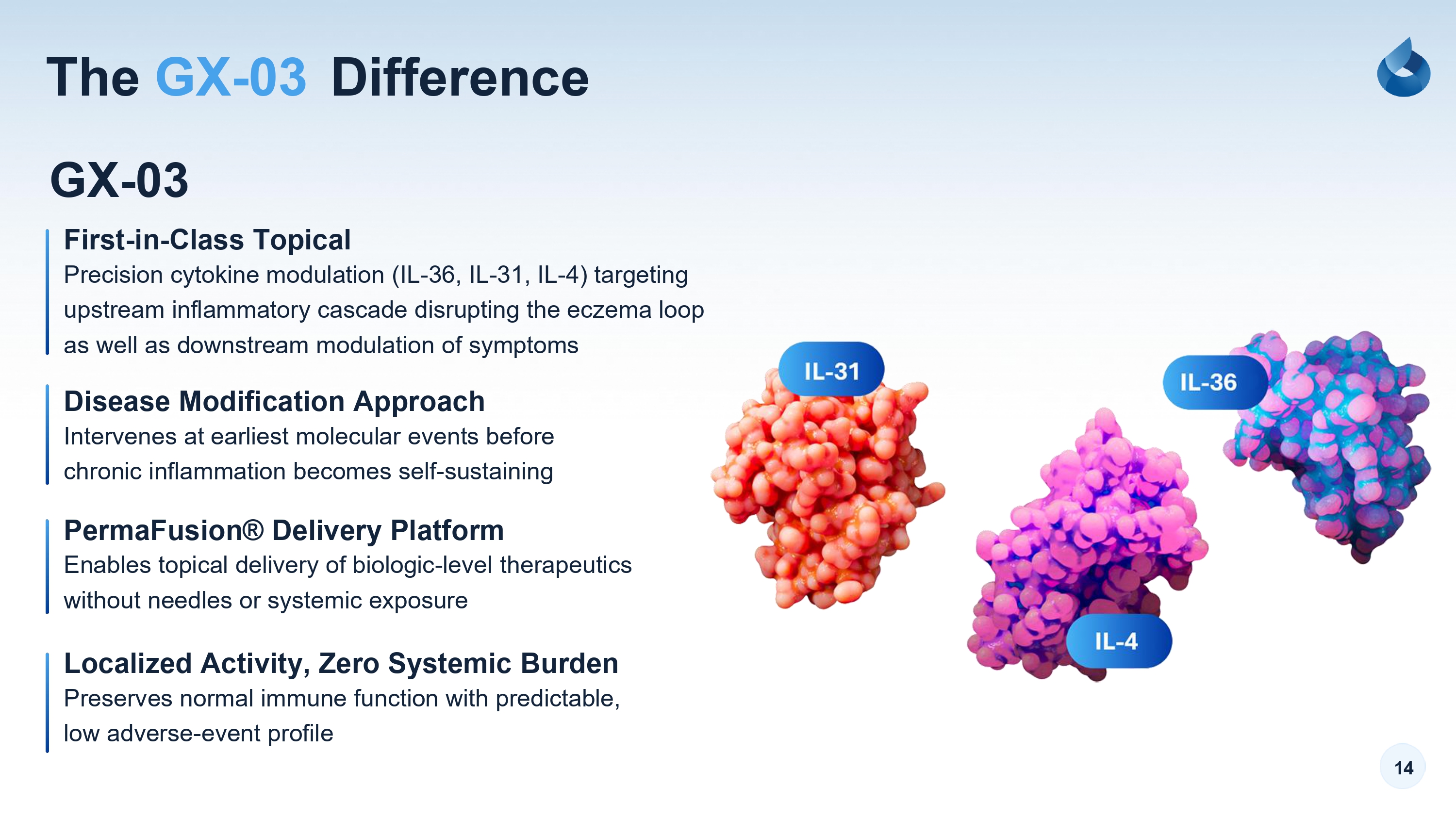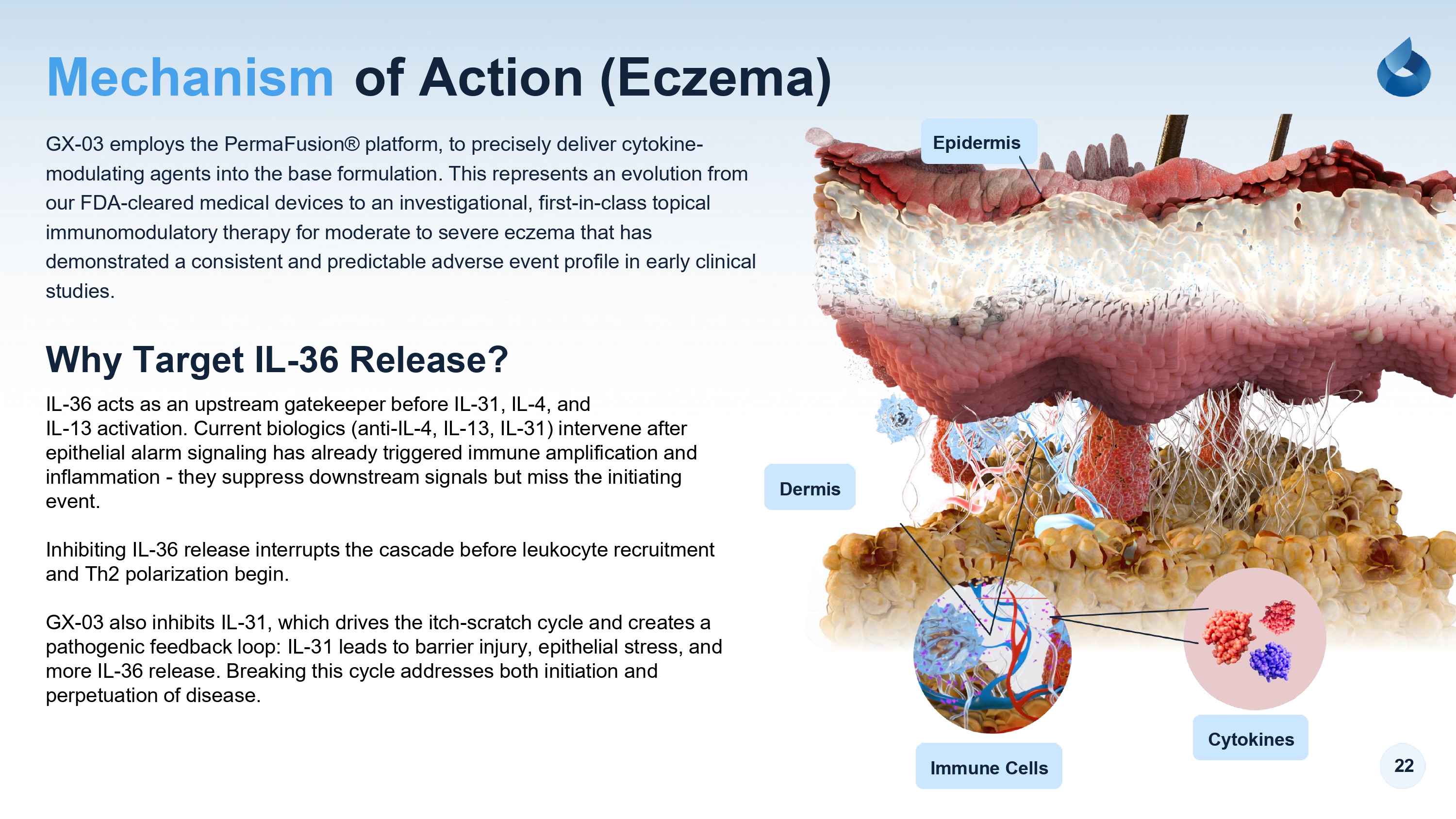 22 of Action (Eczema) Why Target IL - 36 Release? Mechanism GX - 03 employs the PermaFusion® platform, to precisely deliver cytokine - modulating agents into the base formulation. This represents an evolution from our FDA - cleared medical devices to an investigational, first - in - class topical immunomodulatory therapy for moderate to severe eczema that has demonstrated a consistent and predictable adverse event profile in early clinical studies. IL - 36 acts as an upstream gatekeeper before IL - 31, IL - 4, and IL - 13 activation. Current biologics (anti - IL - 4, IL - 13, IL - 31) intervene after epithelial alarm signaling has already triggered immune amplification and inflammation - they suppress downstream signals but miss the initiating event. Inhibiting IL - 36 release interrupts the cascade before leukocyte recruitment and Th2 polarization begin. GX - 03 also inhibits IL - 31, which drives the itch - scratch cycle and creates a pathogenic feedback loop: IL - 31 leads to barrier injury, epithelial stress, and more IL - 36 release. Breaking this cycle addresses both initiation and perpetuation of disease. Immune Cells Dermis Epidermis Cytokines