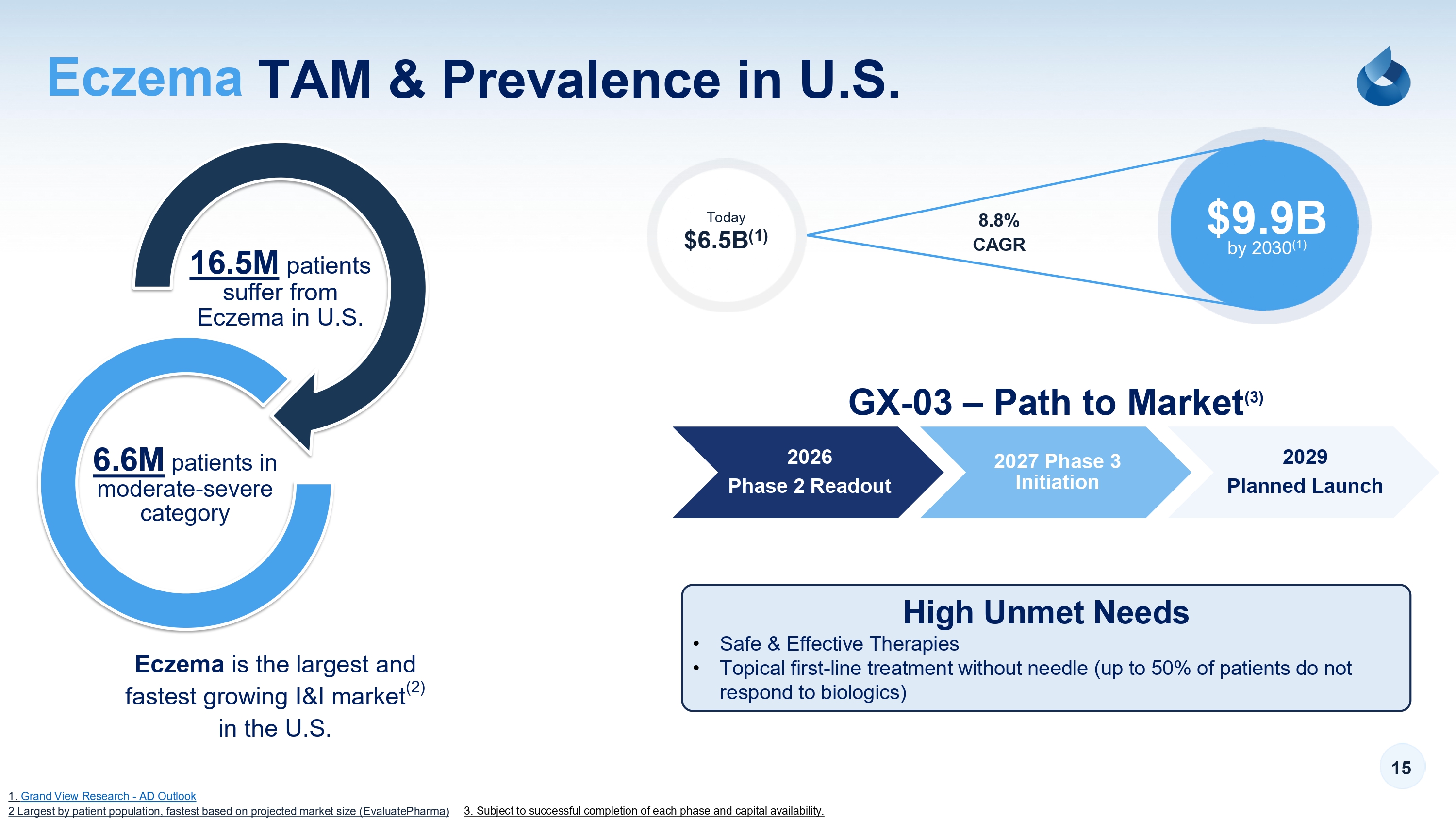 TAM & Prevalence in U.S. Eczema 15 1 . G r a n d V i e w R e s e a r c h - A D O u t l o o k 2 L a r g e s t b y p a t i e n t p o p u l a t i o n , f a s t e s t b a s e d o n p r o j e c t e d m a r k e t s i z e ( E v a l u a t e P h a r m a ) 16.5M p a t i e n t s s u f f e r f r o m E c z e m a i n U . S . 6.6M p a t i e n t s i n m o d e r a t e - s e v e r e c a t e g o r y Eczema i s t h e l a r g e s t a n d f a s t e s t g r o w i n g I & I m a r k e t ( 2 ) i n t h e U . S . 3 . S u b j e c t t o s u c c e s s f u l c o m p l e t i o n o f e a c h p h a s e a n d c a p i t a l a v a i l a b i l i t y . 2026 Phase 2 Readout 2027 Phase 3 Initiation 2029 Planned Launch GX - 03 – Path to Market (3) T o d a y $6.5B (1) $9.9B b y 2 0 3 0 ( 1 ) 8.8% CAGR High Unmet Needs • S a f e & E f f e c t i v e T h e r a p i e s • T o p i c a l f i r s t - l i n e t r e a t m e n t w i t h o u t n e e d l e ( u p t o 5 0 % o f p a t i e n t s d o n o t r e s p o n d t o b i o l o g i c s )
