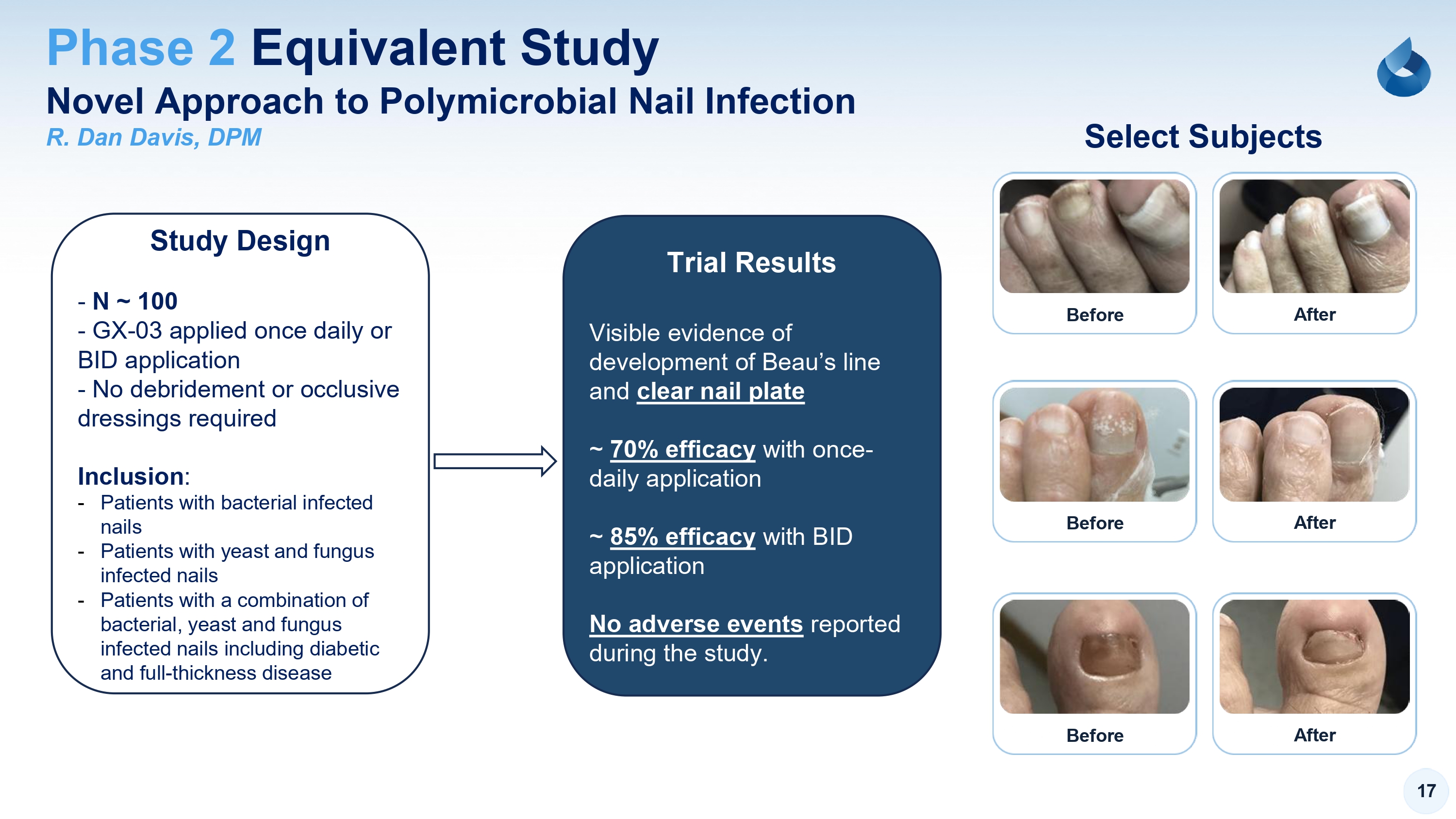 17 Novel Approach to Polymicrobial Nail Infection R. Dan Davis, DPM Phase 2 Equivalent Study Study Design - N ~ 100 - GX - 03 applied once daily or BID application - No debridement or occlusive dressings required Inclusion : - Patients with bacterial infected nails - Patients with yeast and fungus infected nails - Patients with a combination of bacterial, yeast and fungus infected nails including diabetic and full - thickness disease Trial Results Visible evidence of development of Beau’s line and clear nail plate ~ 70% efficacy with once - daily application ~ 85% efficacy with BID application No adverse events reported during the study. Select Subjects Before After Before After Before After