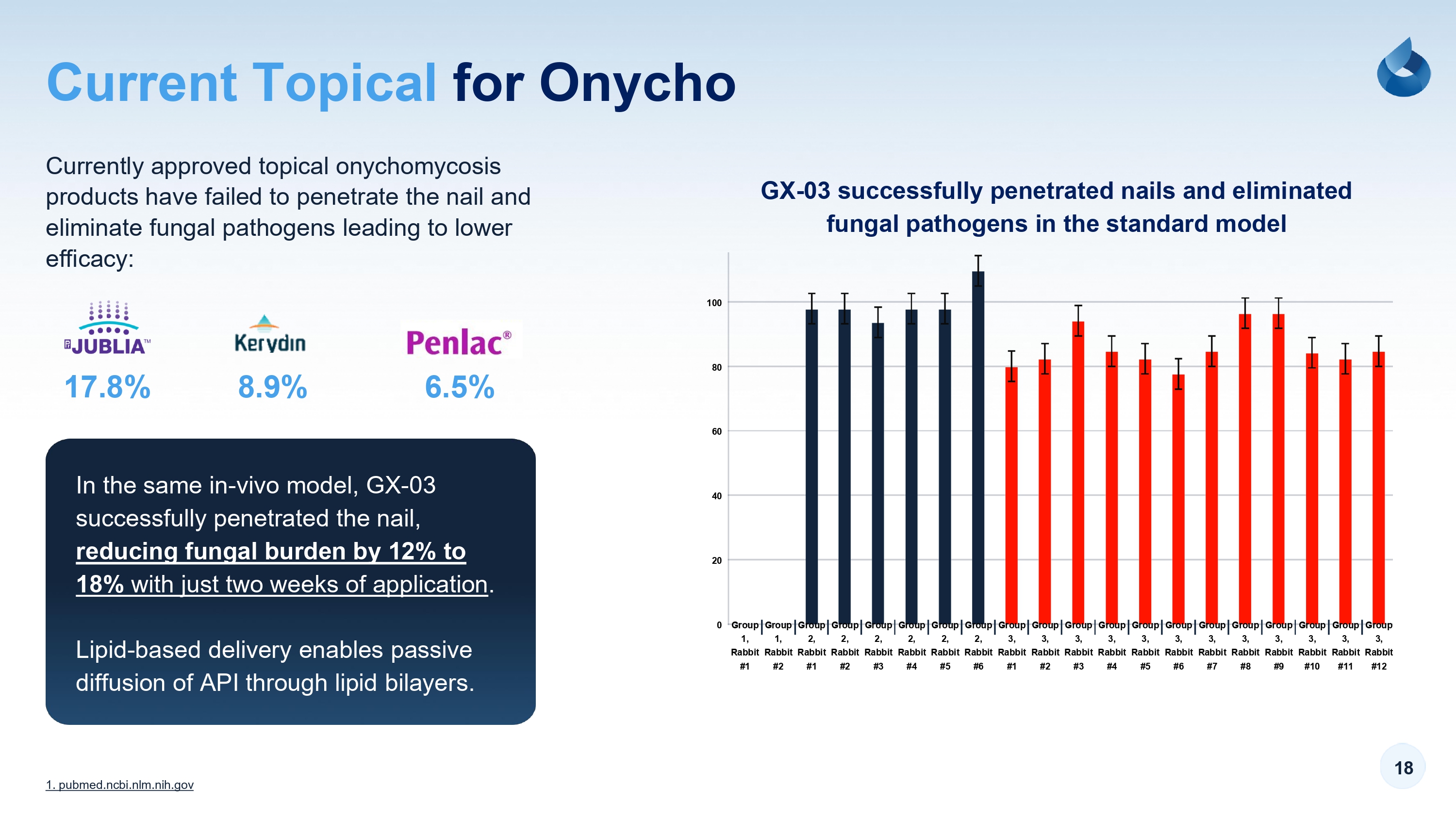 18 1. pubmed.ncbi.nlm.nih.gov GX - 03 successfully penetrated nails and eliminated fungal pathogens in the standard model 8.9% 6.5% 17.8% In the same in - vivo model, GX - 03 successfully penetrated the nail, reducing fungal burden by 12% to 18% with just two weeks of application. Lipid - based delivery enables passive diffusion of API through lipid bilayers. Currently approved topical onychomycosis products have failed to penetrate the nail and eliminate fungal pathogens leading to lower efficacy: Group 1, Rabbit #1 Group 1, Rabbit #2 Group 2, Rabbit #1 Group 2, Rabbit #2 Group 2, Rabbit #3 Group 2, Rabbit #4 Group 2, Rabbit #5 Group 2, Rabbit #6 Group 3, Rabbit #1 Group 3, Rabbit #2 Group 3, Rabbit #3 Group 3, Rabbit #4 Group 3, Rabbit #5 Group 3, Rabbit #6 Group 3, Rabbit #7 Group 3, Rabbit #8 Group 3, Rabbit #9 Group 3, Rabbit #10 Group 3, Rabbit #11 Group 3, Rabbit #12 100 80 60 40 20 0 Current Topical for Onycho
