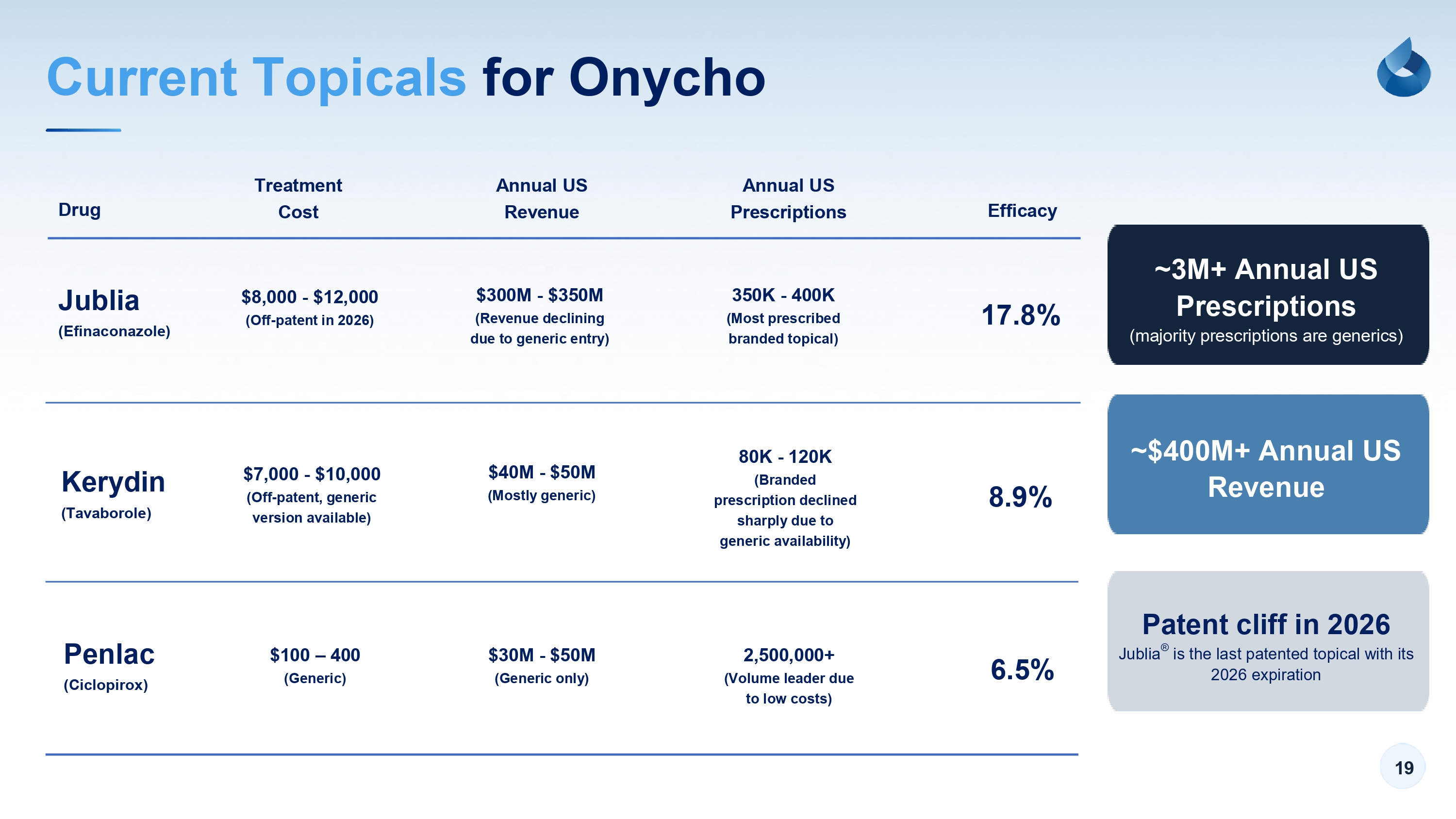 19 Current Topicals for Onycho Drug Treatment Cost Annual US Revenue Efficacy Jublia (Efinaconazole) Kerydin (Tavaborole) Penlac (Ciclopirox) $8,000 - $12,000 (Off - patent in 2026) $7,000 - $10,000 (Off - patent, generic version available) $100 – 400 (Generic) $300M - $350M (Revenue declining due to generic entry) $40M - $50M (Mostly generic) $30M - $50M (Generic only) Annual US Prescriptions 350K - 400K (Most prescribed branded topical) 80K - 120K (Branded prescription declined sharply due to generic availability) 2,500,000+ (Volume leader due to low costs) 17.8% 8.9% 6.5% ~3M+ Annual US Prescriptions (majority prescriptions are generics) ~$400M+ Annual US Revenue Patent cliff in 2026 Jublia ® is the last patented topical with its 2026 expiration