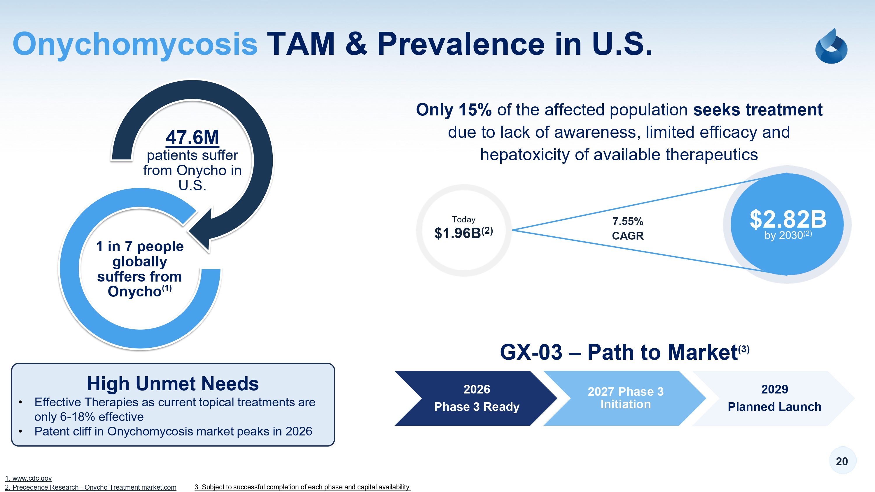 TAM & Prevalence in U.S. Onychomycosis 20 47.6M patients suffer from Onycho in U.S. 1 in 7 people globally suffers from Onycho (1) 2026 Phase 3 Ready 2027 Phase 3 Initiation 2029 Planned Launch GX - 03 – Path to Market (3) Today $1.96B (2) $2.82B by 2030 (2) 7.55% CAGR High Unmet Needs • Effective Therapies as current topical treatments are only 6 - 18% effective • Patent cliff in Onychomycosis market peaks in 2026 1. www.cdc.gov 2. Precedence Research - Onycho Treatment market.com Only 15% of the affected population seeks treatment due to lack of awareness, limited efficacy and hepatoxicity of available therapeutics 3. Subject to successful completion of each phase and capital availability.