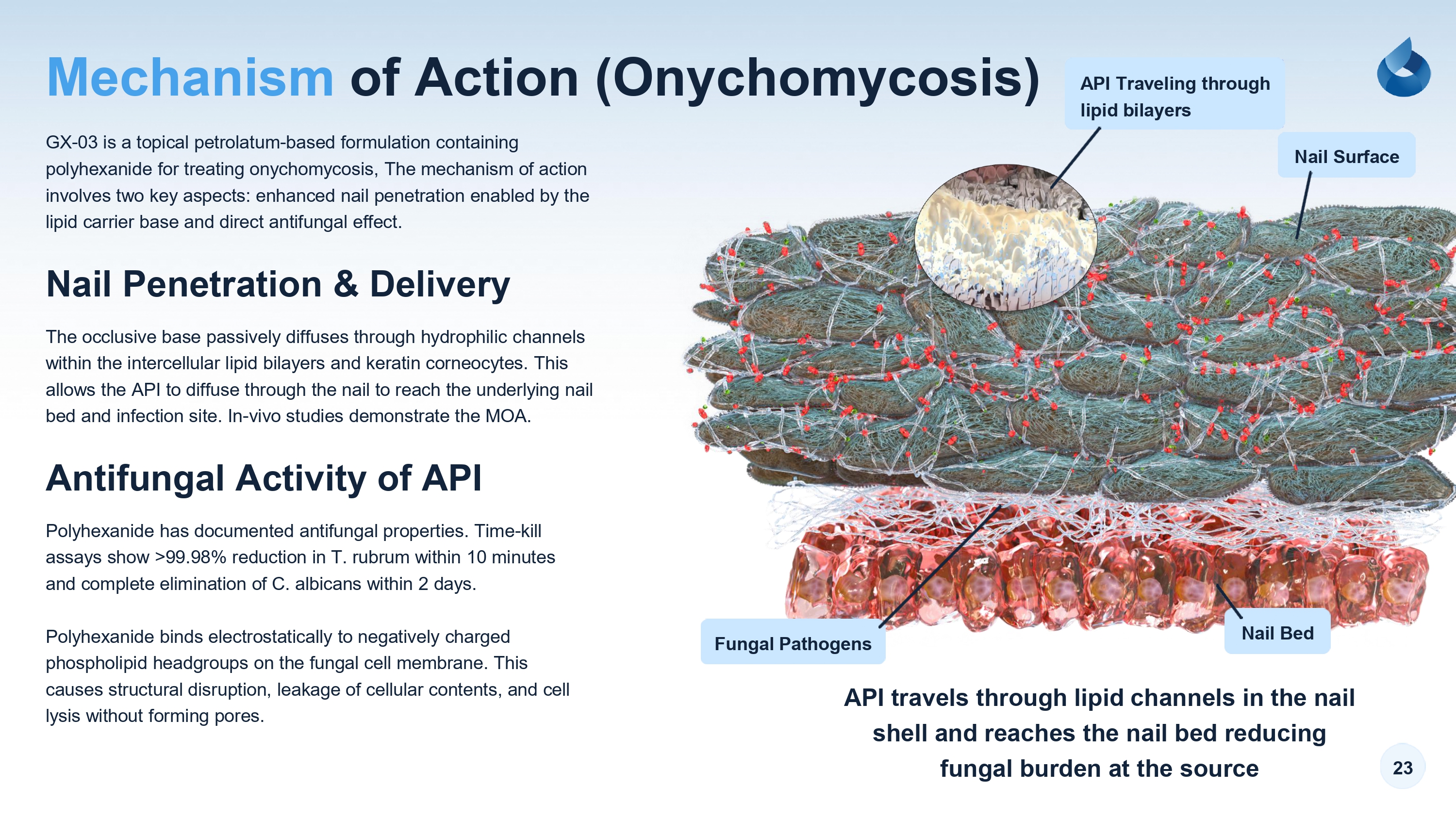23 of Action (Onychomycosis) Nail Penetration & Delivery Mechanism GX - 03 is a topical petrolatum - based formulation containing polyhexanide for treating onychomycosis, The mechanism of action involves two key aspects: enhanced nail penetration enabled by the lipid carrier base and direct antifungal effect. The occlusive base passively diffuses through hydrophilic channels within the intercellular lipid bilayers and keratin corneocytes. This allows the API to diffuse through the nail to reach the underlying nail bed and infection site. In - vivo studies demonstrate the MOA. Antifungal Activity of API Polyhexanide has documented antifungal properties. Time - kill assays show >99.98% reduction in T. rubrum within 10 minutes and complete elimination of C. albicans within 2 days. Polyhexanide binds electrostatically to negatively charged phospholipid headgroups on the fungal cell membrane. This causes structural disruption, leakage of cellular contents, and cell lysis without forming pores. API Traveling through lipid bilayers Fungal Pathogens Nail Bed Nail Surface API travels through lipid channels in the nail shell and reaches the nail bed reducing fungal burden at the source