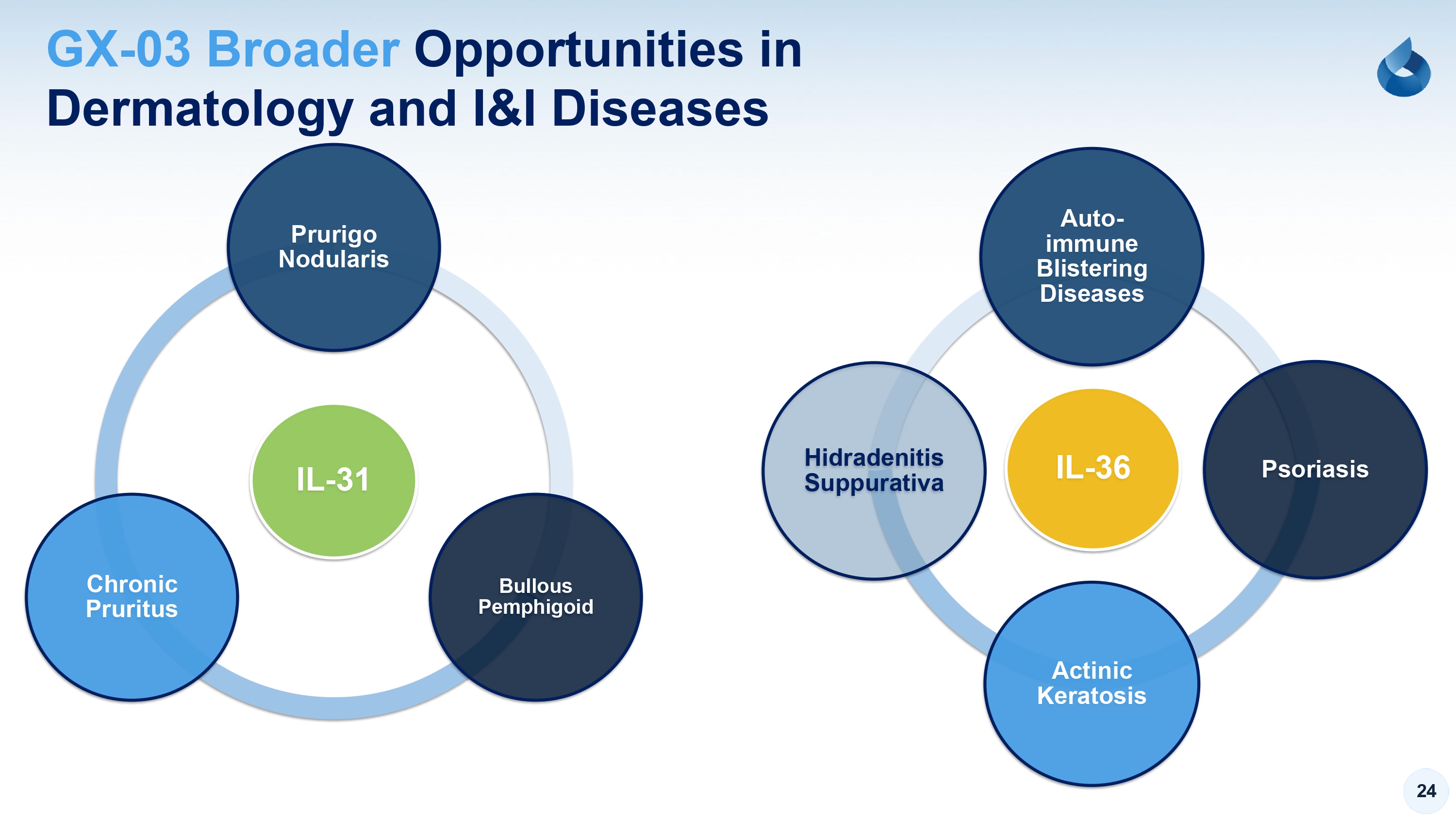 24 GX - 03 Broader Opportunities in Dermatology and I&I Diseases IL - 36 Auto - immune Blistering Diseases Psoriasis Actinic Keratosis Hidradenitis Suppurativa IL - 31 Prurigo Nodularis Bullous Pemphigoid Chronic Pruritus