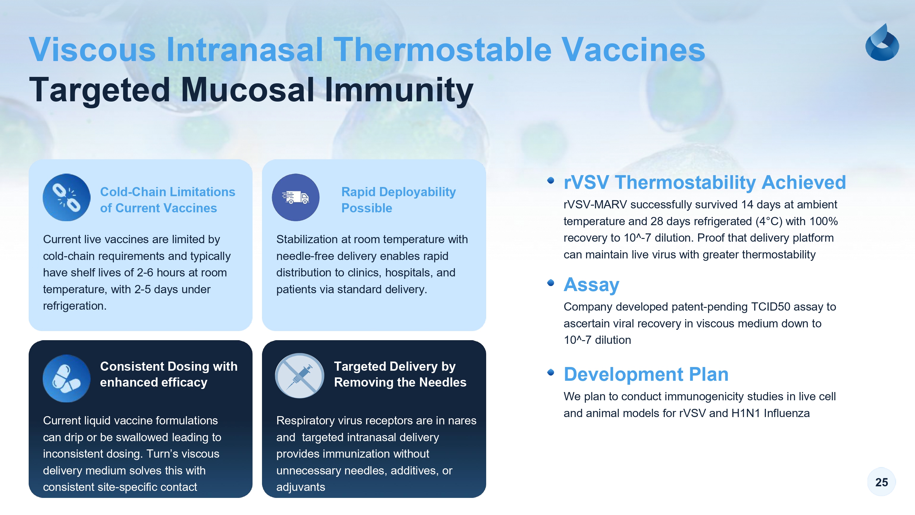 25 Viscous Intranasal Thermostable Vaccines Targeted Mucosal Immunity Current liquid vaccine formulations can drip or be swallowed leading to inconsistent dosing. Turn’s viscous delivery medium solves this with consistent site - specific contact Respiratory virus receptors are in nares and targeted intranasal delivery provides immunization without unnecessary needles, additives, or adjuvants Cold - Chain Limitations of Current Vaccines Consistent Dosing with enhanced efficacy Targeted Delivery by Removing the Needles Rapid Deployability Possible rVSV Thermostability Achieved Assay Current live vaccines are limited by cold - chain requirements and typically have shelf lives of 2 - 6 hours at room temperature, with 2 - 5 days under refrigeration. Stabilization at room temperature with needle - free delivery enables rapid distribution to clinics, hospitals, and patients via standard delivery. rVSV - MARV successfully survived 14 days at ambient temperature and 28 days refrigerated (4 ° C) with 100% recovery to 10^ - 7 dilution. Proof that delivery platform can maintain live virus with greater thermostability Company developed patent - pending TCID50 assay to ascertain viral recovery in viscous medium down to 10^ - 7 dilution Development Plan We plan to conduct immunogenicity studies in live cell and animal models for rVSV and H1N1 Influenza