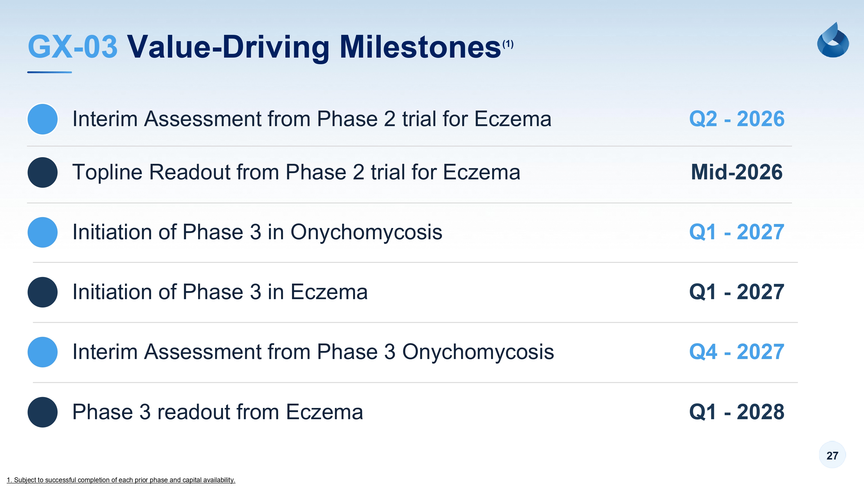 27 GX - 03 Value - Driving Milestones (1) Interim Assessment from Phase 2 trial for Eczema Q2 - 2026 Topline Readout from Phase 2 trial for Eczema Mid - 2026 Initiation of Phase 3 in Onychomycosis Q1 - 2027 Initiation of Phase 3 in Eczema Q1 - 2027 Phase 3 readout from Eczema Q4 - 2027 Interim Assessment from Phase 3 Onychomycosis Q1 - 2028 1. Subject to successful completion of each prior phase and capital availability.