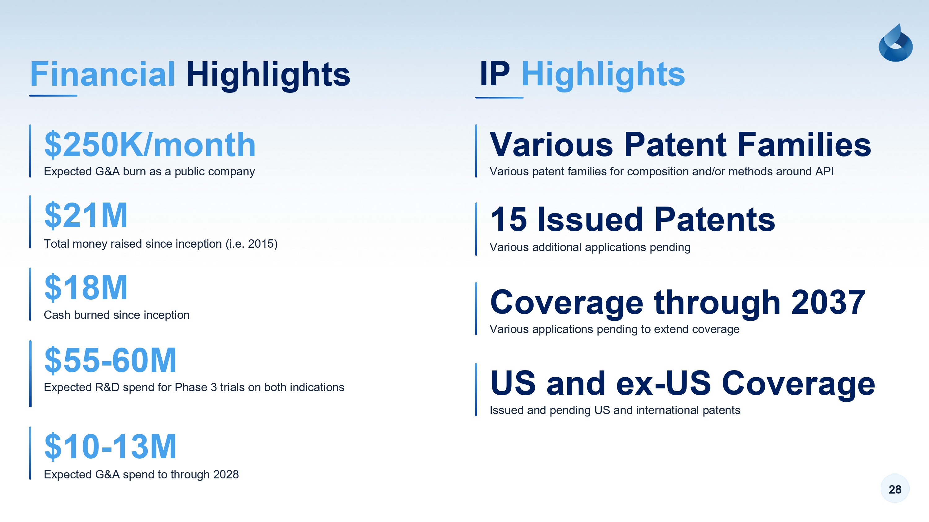 28 Financial Highlights $21M $18M Cash burned since inception $55 - 60M Expected R&D spend for Phase 3 trials on both indications $250K/month Expected G&A burn as a public company $10 - 13M Expected G&A spend to through 2028 IP Highlights Total money raised since inception (i.e. 2015) Various Patent Families Various patent families for composition and/or methods around API 15 Issued Patents Coverage through 2037 Various applications pending to extend coverage Various additional applications pending US and ex - US Coverage Issued and pending US and international patents