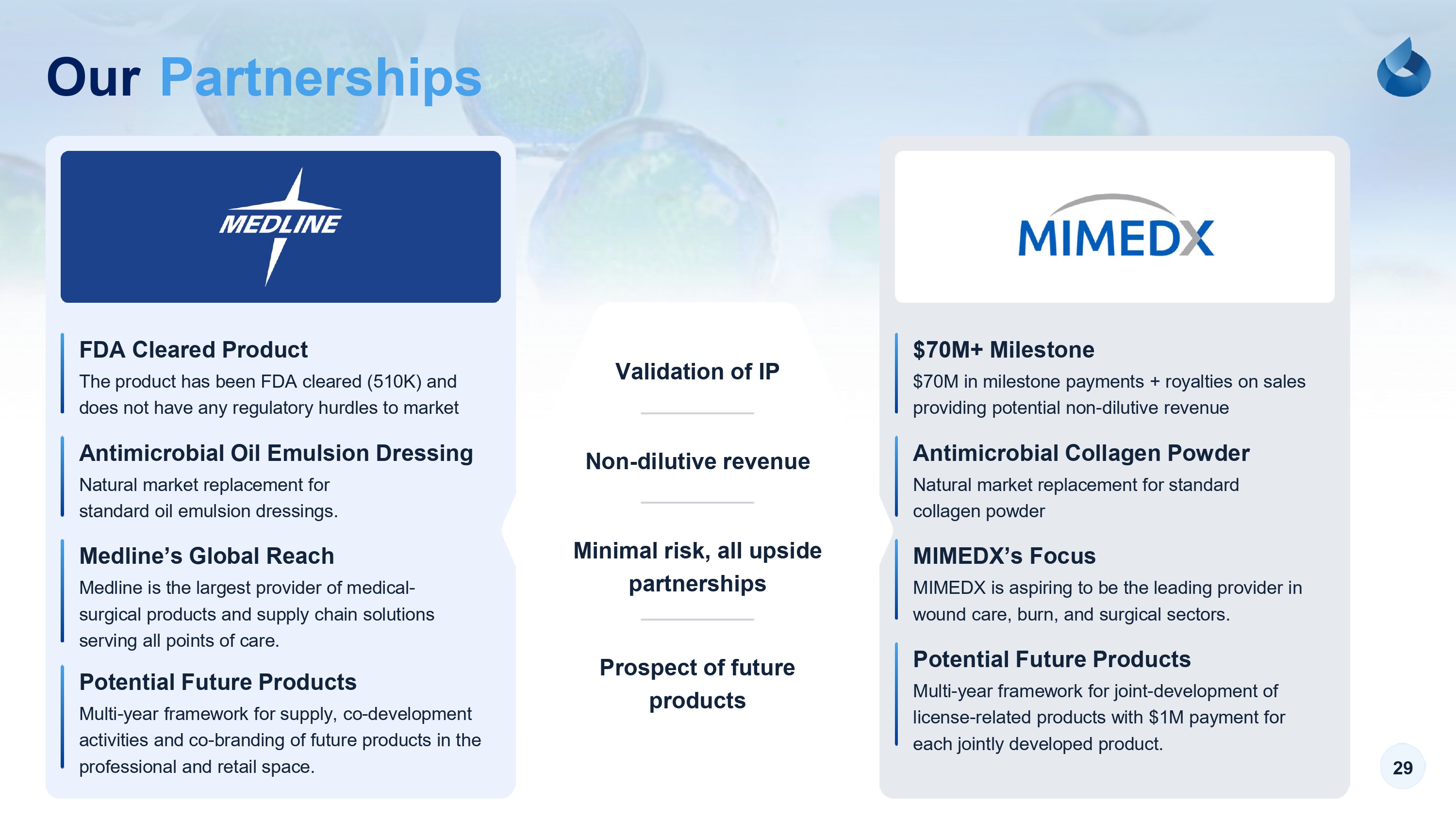 29 Our Partnerships The product has been FDA cleared (510K) and does not have any regulatory hurdles to market $70M in milestone payments + royalties on sales providing potential non - dilutive revenue Medline is the largest provider of medical - surgical products and supply chain solutions serving all points of care. MIMEDX is aspiring to be the leading provider in wound care, burn, and surgical sectors. Natural market replacement for standard oil emulsion dressings. Natural market replacement for standard collagen powder Multi - year framework for supply, co - development activities and co - branding of future products in the professional and retail space. Multi - year framework for joint - development of license - related products with $1M payment for each jointly developed product. FDA Cleared Product $70M+ Milestone Medline’s Global Reach MIMEDX’s Focus Antimicrobial Oil Emulsion Dressing Antimicrobial Collagen Powder Potential Future Products Potential Future Products Validation of IP Non - dilutive revenue Minimal risk, all upside partnerships Prospect of future products
