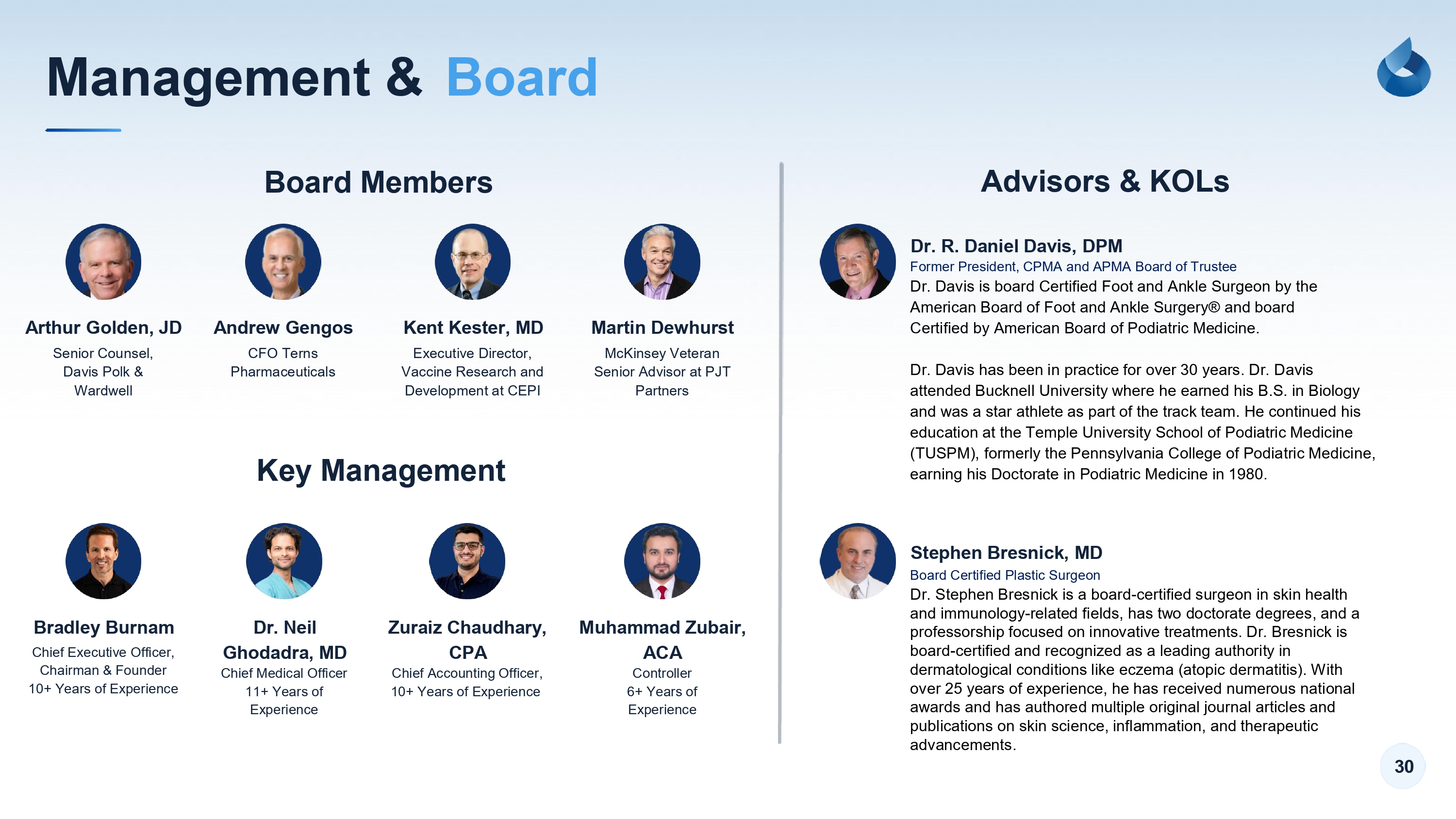 30 Management & Board Board Members Advisors & KOLs Dr. R. Daniel Davis, DPM Stephen Bresnick, MD Arthur Golden, JD Andrew Gengos Kent Kester, MD Martin Dewhurst Senior Counsel, Davis Polk & Wardwell CFO Terns Pharmaceuticals Executive Director, Vaccine Research and Development at CEPI McKinsey Veteran Senior Advisor at PJT Partners Bradley Burnam Zuraiz Chaudhary, CPA Dr. Neil Ghodadra, MD Muhammad Zubair, ACA Chief Executive Officer, Chairman & Founder 10+ Years of Experience Chief Accounting Officer, 10+ Years of Experience Chief Medical Officer 11+ Years of Experience Controller 6+ Years of Experience Key Management Board Certified Plastic Surgeon Dr. Stephen Bresnick is a board - certified surgeon in skin health and immunology - related fields, has two doctorate degrees, and a professorship focused on innovative treatments. Dr. Bresnick is board - certified and recognized as a leading authority in dermatological conditions like eczema (atopic dermatitis). With over 25 years of experience, he has received numerous national awards and has authored multiple original journal articles and publications on skin science, inflammation, and therapeutic advancements. Former President, CPMA and APMA Board of Trustee Dr. Davis is board Certified Foot and Ankle Surgeon by the American Board of Foot and Ankle Surgery® and board Certified by American Board of Podiatric Medicine. Dr. Davis has been in practice for over 30 years. Dr. Davis attended Bucknell University where he earned his B.S. in Biology and was a star athlete as part of the track team. He continued his education at the Temple University School of Podiatric Medicine (TUSPM), formerly the Pennsylvania College of Podiatric Medicine, earning his Doctorate in Podiatric Medicine in 1980.