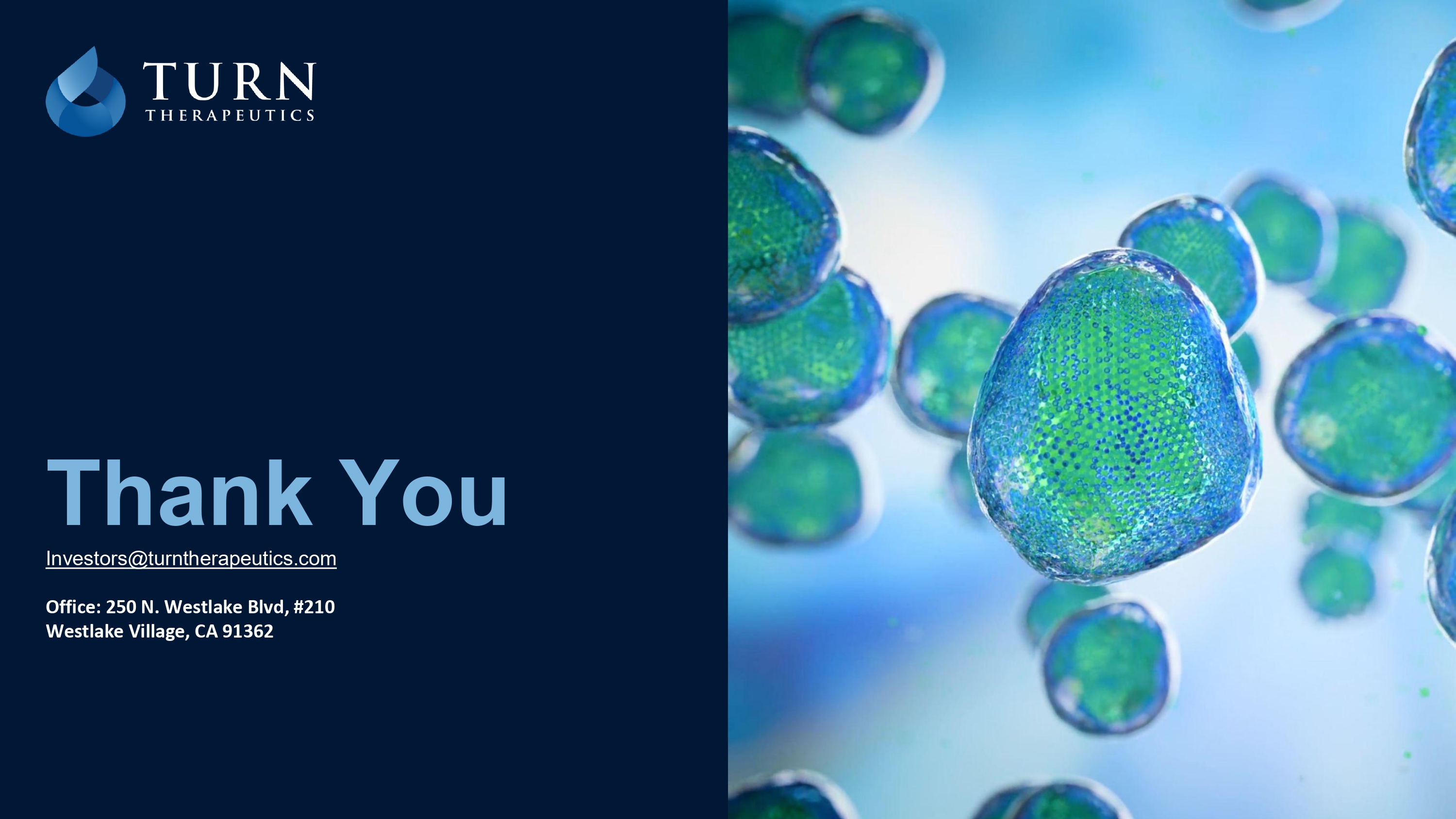 Thank You Investors@turntherapeutics.com Office: 250 N. Westlake Blvd, #210 Westlake Village, CA 91362